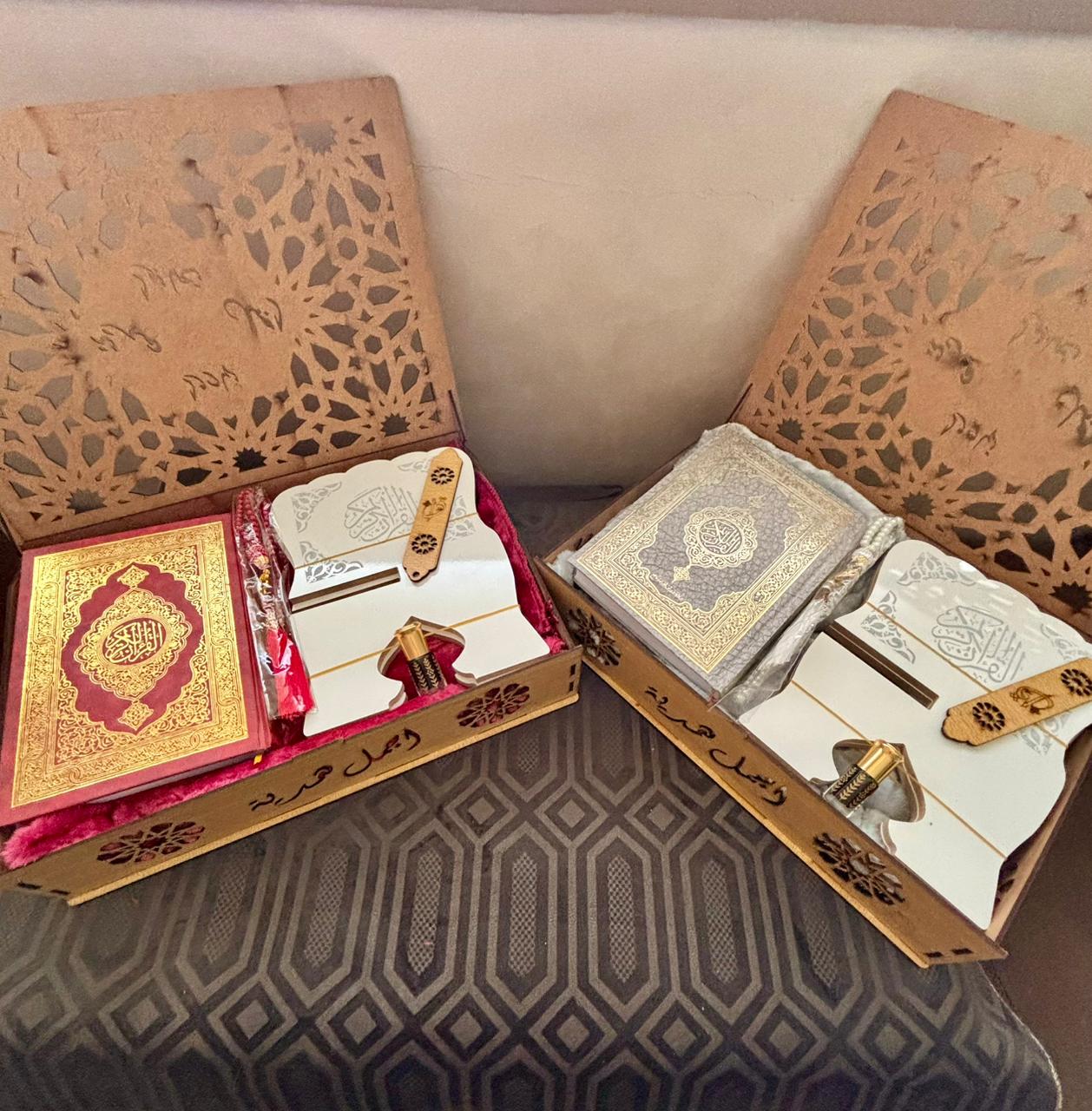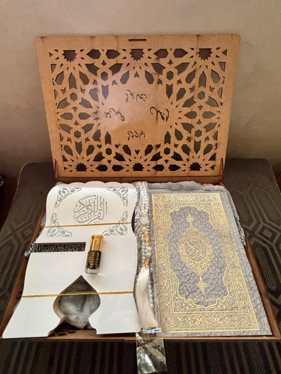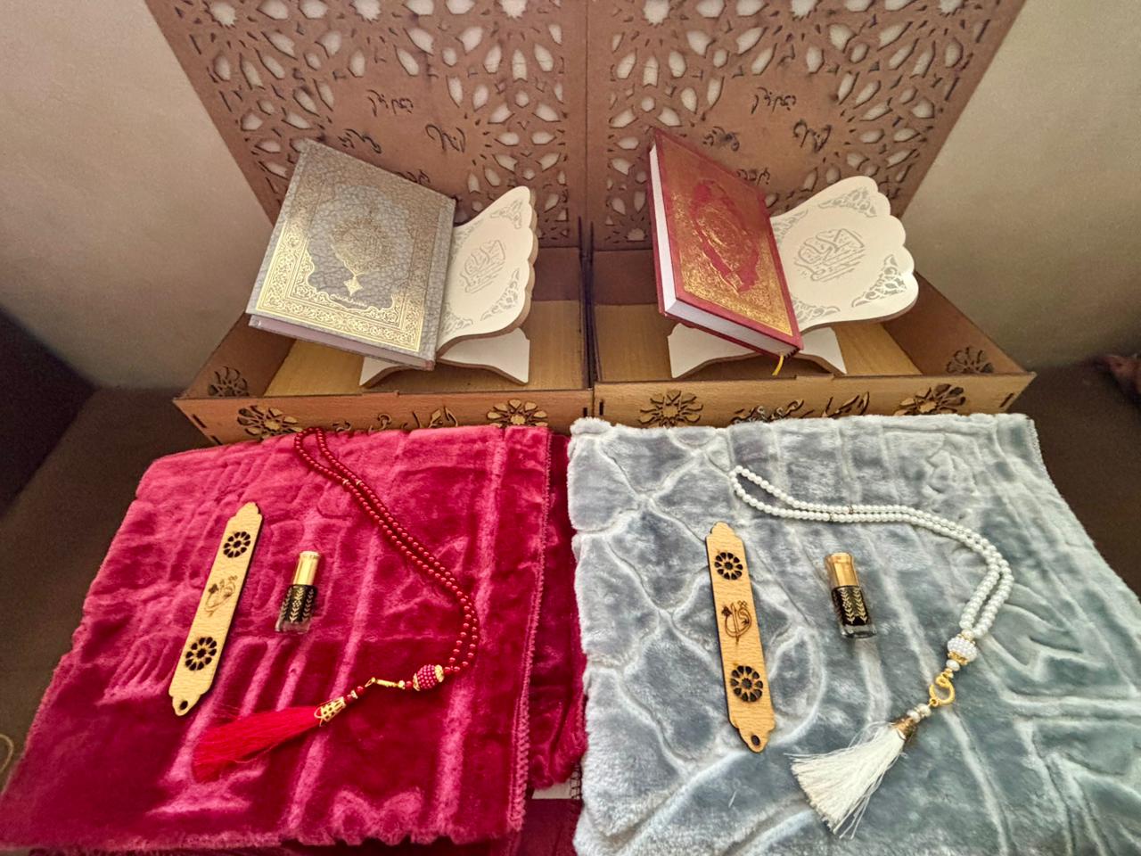 📖 مصحف شريف – للقراءة والتدبر. 🕌 سجادة صلاة ناعمة ومريحة. 📿 مسبحة فاخرة – للتسبيح والذكر. 🌸 عود بخور أصيل – لتعطير البيت والروح.